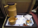 続いてポットに入ったチャイと、ビスケット、キャラメルが配られる。
